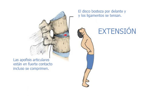 En la extensión sucede lo contrario. Las apófisis articulares están en fuerte contacto mientras que la parte de adelante abra. El núcleo se desplaza hacia adelante y el ligamento anterior se pone en tensión.